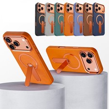 For iPhone 17/16/15 Pro Max Leather Texture Shockproof Mag Safe Case with Stand